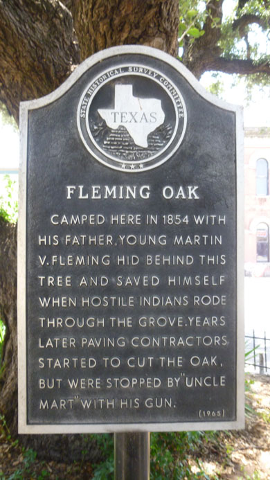 In 1983 the Comanche County Historical Commission sponsored the relocating of Old Cora. The Old Cora Commission, appointed by the Commissioners Court, selected the county square as the permanent site, placing the 1857 courthouse near the Fleming oak, the tree under which M.V. Fleming, who surpervised construction of the 1875 courthouse, spent his first night in the county in 1854.