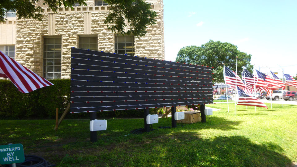 As I walked around the east side of the courthouse, I found that they were, apparently, getting ready for the celebrations on July 4th. At one place, there was and electronic board set up, presumably to spell out words during the displays. And of course, there were already lots of American flags flapping in the very light breeze, all around the courthouse. I also took one last picture of an odd sign, one I don't think I'd seen before.