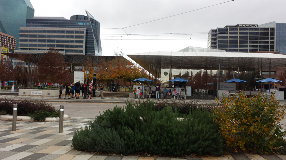 Fred and I have ridden our bikes down here from home quite a few times; the KATY Trail takes us from SMU all the way to the American Airlines center, about four blocks from the park to the southwest. Today, when we met back together, the six of us walked over to the park and walked down to Savor, which is a restaurant in the main pavilion. At the northeast end of the pavilion the restaurant runs a little food-truck-like sandwich and burger shop where we had lunch. While waiting for our orders to be ready, Fred and I used my phone to take a couple of pictures: