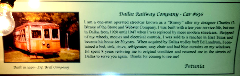 As a heritage streetcar, the M-Line runs restored, vintage cars; ours was Car 636 The "Petunia". Car 636 was part of a 1910 order for 25 streetcars from the J. G. Brill Company. Petunia, a "Birney Safety Car," which incorporated numerous operational and safety improvements over earlier streetcars. It permitted one man operation and thereby allowed street railway companies to reduce their expenses. Birneys were known for their bouncy riding qualities and were never very popular with the Dallas riding public. Nevertheless, 636 ran in Dallas until 1947 when it was replaced by more modern equipment. Part of the car's restoration included shock absorbers.