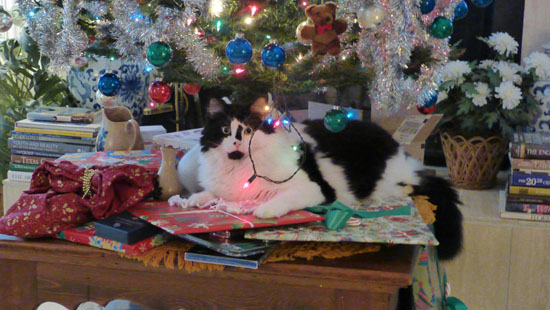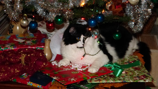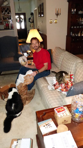 On Christmas morning, Fred and I and the cats opened the gifts we'd all gotten for each other, and we took some candid shots of the process as we went. In addition to the two at left, six others turned out good enough to include here, and if you want to see any of them you can just click on the thumbnail images below: