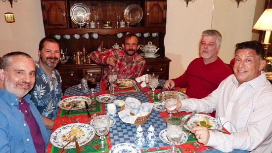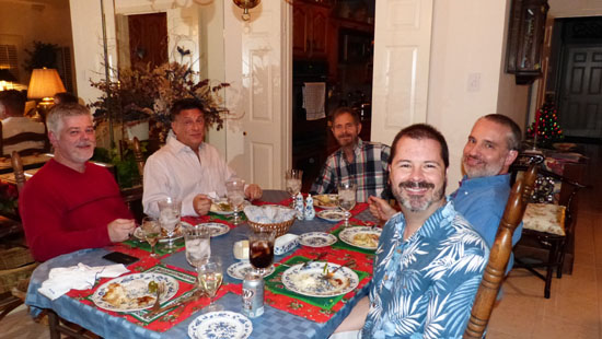 Again as with Christmases past, supper has been a time to be shared with our friends. This year, we had our friends Steve and Mario, John Evans and Lou. Everyone contributed to the dinner, at which we all had a great time. Instead of setting up the tripod as we usually do, Fred and I each took one picture of the group at the dinner table to get ourselves in. Here are those pictures: