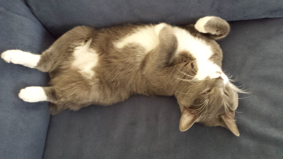 Both Zack and Bob, will sleep just about anywhere. I suppose they like chairs, beds, sofas, and the like most of all, but all four of our cats will also just plop down on the floor if that's where they happen to be when the mood strikes. Bob, particularly, sleeps not curled up as one thinks most cats usually do, but often on his back with all four paws akimbo- sticking up and out in just about every direction imaginable.