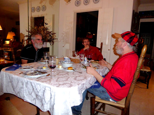 Fred and I just futzed around for most of the rest of the day, going out for a walk and doing routine things until Justin and Gary arrived about 5:30 bearing gifts. It is always a pleasure to have the guys over for a meal; they always have lots of stories to tell, many of which involve the various dog shows that Gary and Justin go to with their championship dogs. (Justin also brought a frozen casserole for us to put in the freezer and enjoy sometime when we don't feel like cooking.) Both Fred and I took a few pictures during the meal, and these are below: