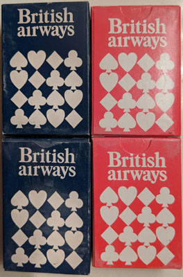 The other "odd" airline was British Airways. While all the other airlines gave away "regulation-size" decks of cards, British Airways was a bit more considerate of their passengers and gave them decks that were a little less than half the size of a regulation deck- ideal for playing solitaire on a standard tray table! I ended up with six or eight of these really cute decks of cards, and now they are a collector's item.