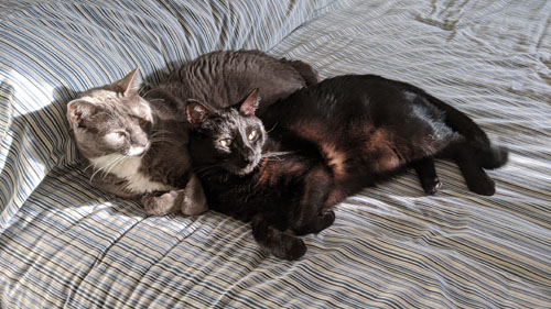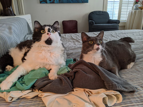 This afternoon, Lucky and Bob had homesteaded my recumbent bike clothes just taken from the dryer (as one or more of the cats always do). They looked particularly photogenic, and so I took a couple of very similar photos: