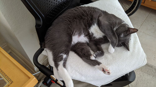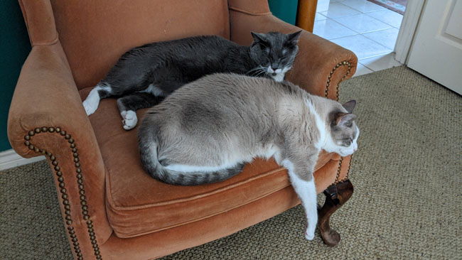 When I first spied the two of them napping together, they were both totally on the chair cushion, but when I returned with my phone Zack had relaxed even more, and his right front paw had slipped out from under his body and now hung down towards the floor. This made him look even more relaxed than he had earlier.