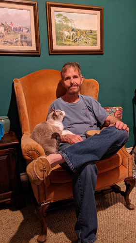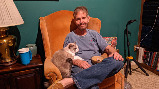 So one of the common situations around my house occurs whenever I sit down in a chair in the study; if Zack is around, he will get up from wherever he is and come over and get in the chair with me. Usually, he sits on the chair arm and just keeps me company, but if I entice him he will snuggle down beside me. This does sometimes make it hard for me to drink something, eat something, or even read a book, but that's what happens. And he will stay there until I get up. It's endearing, but he does get in the way sometimes.