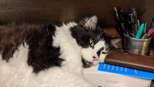 Lucky is so big and has so much fur that no matter where he lays down, it doesn't much matter what he is laying on- he has plenty of padding to make almost anywhere comfortable. There is usually lots of stuff on the desktop, but that doesn't bother him.