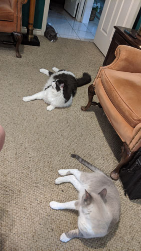 This confluence of cats was so unusual that I took quite a few pictures, so here are a few more of the four cats in different poses: