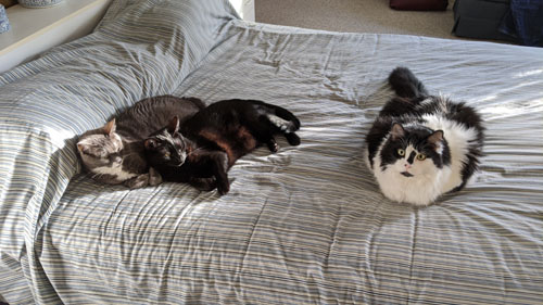 With four cats, it sometimes seems as if we are living in the Star Trek episode "The Trouble With Tribbles", in which the Enterprise takes aboard a single furry animal called a tribble. Unbeknownst to the crew, they are incredibly prolific (they are actually born pregnant), and soon the ship is littered with them. When the cats are lying all about, that's what they remind me of. But it is always a pleasure to pick 'em up and pet them.