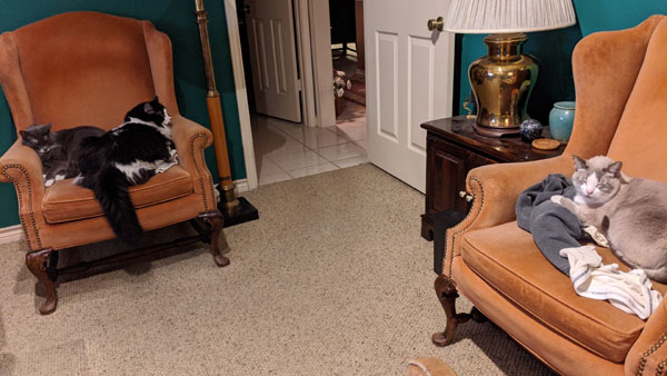 But this afternoon, both cats seemed to be in "down" mode at the same time and, in an event that also doesn't happen very often, decided to occupy the same chair.