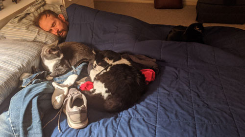 Cats sleeping on clothes has been a running theme in the pet pictures for the last few years; Lucky was the first adherent, but all the cats are attracted to one degree or another.