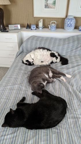 Sheltering in place is a lot easier with the cats in residence- particularly when Fred isn't here. Today, for example, he has Zack with him at his house, so I am left with Cole, Bob, and Lucky. This afternoon, they are all asleep together on the bed- not a typical experience. So I took this opportunity to take a couple of pictures.