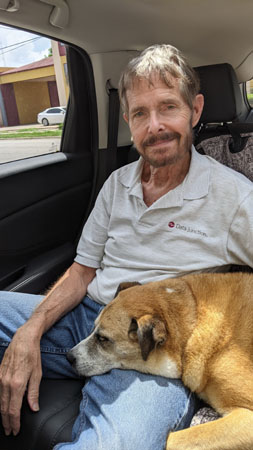 Fred took the picture at right on one of the days when Prudence drove to the gallery and took Jax with her. I thought it was a nice portrait of the two of us.