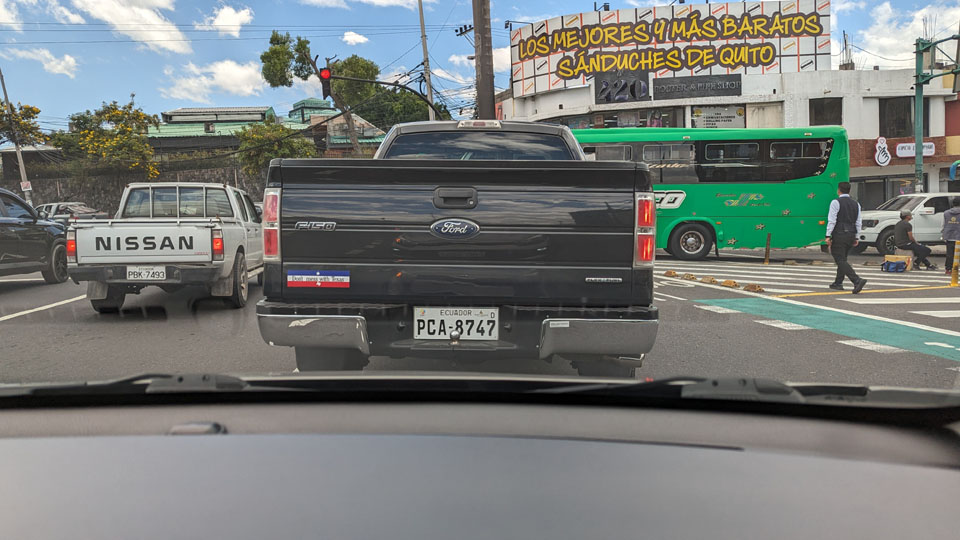 Oddly enough, just as our Uber was leaving the Paseo San Francisco to head around the traffic circle and back down southwest to connect up with the highway that goes to Quito, I looke just ahead of us at the stoplight, and simply couldn't resist taking a picture of the truck ahead of us. If you will look closely at this Ecuadorian-licensed vehicle, you'll see a bumper stick on the left of the tailgate. I would love to know the story of how the driver came to put it there. We don't take this southern route to Quito often, unless we are going to the old city, but on the way into the city I snapped this picture of a new tower with a mosaic on the side of it. The utility lines spoil the picture, but they are ubiquitous in Quito.