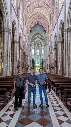 Eventually, it was our turn to climb the two flights of steep stairs to the upper platform, and the views (as we thought they might be) were really neat. Take the picture below, for example, looking across the church roof to the front clock towers (stitched together from three separate photos):