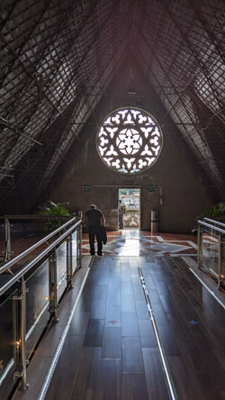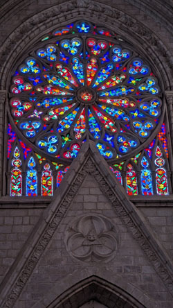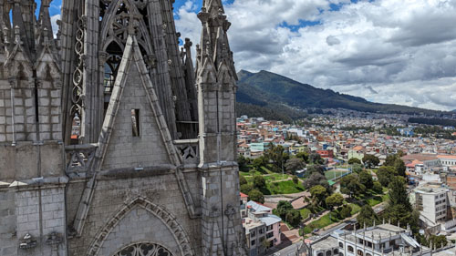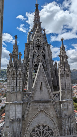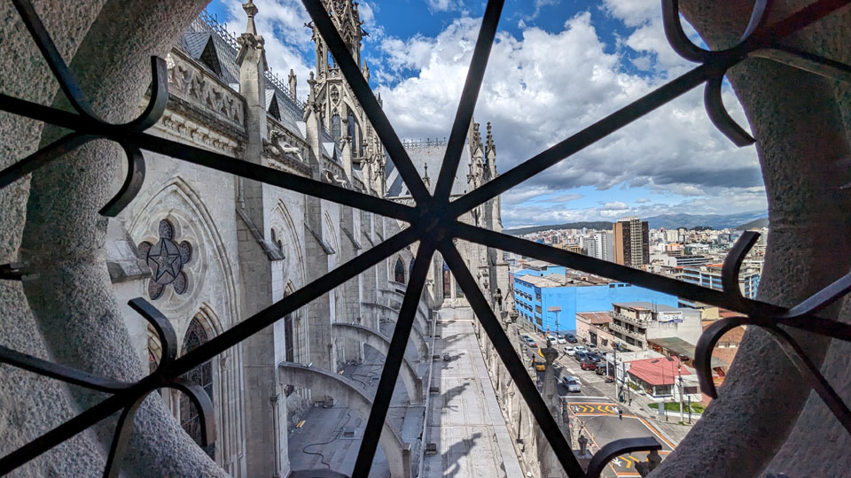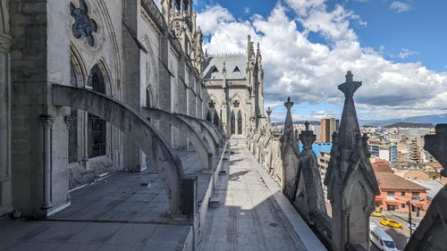 There are stairs and an elevator, so we took the latter to the third level of the tower. Here there is a cafe, a closeup of the front rose window, and the pathway across the roof of the nave to the tower at the other end of the church. There was also an open area with good views out across Quito.