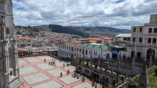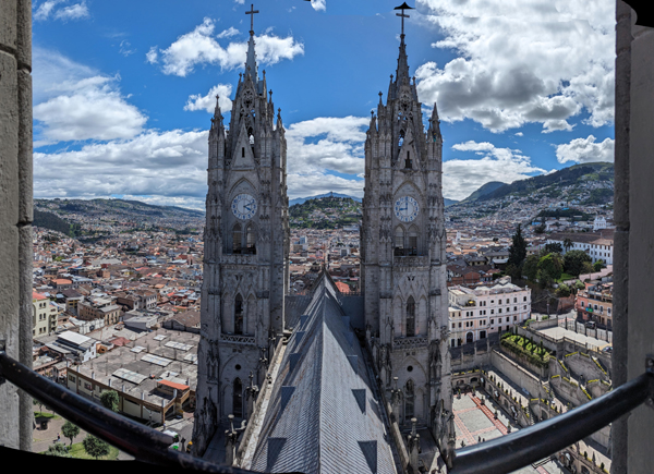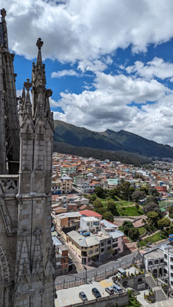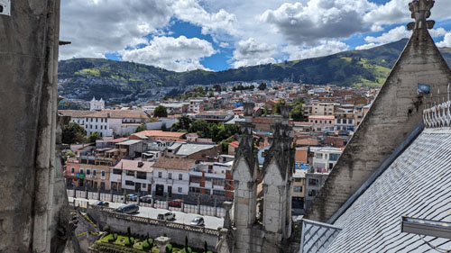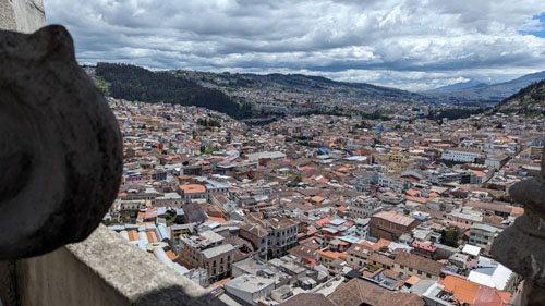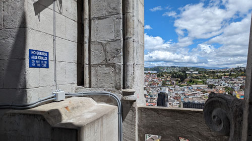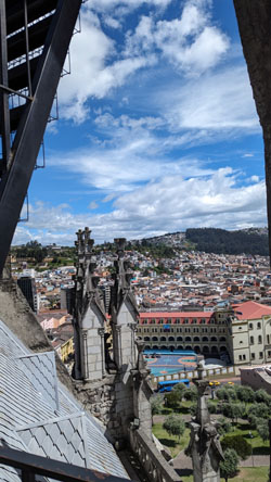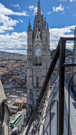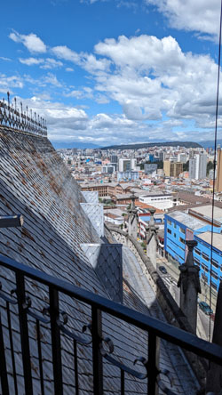 I'll come back to the Rose Window in a moment, but for now we took the stairs up another level to find ourselves on the level that has us behind the clock faces (there are faces on three sides of the tower). Before we look at the clock, there was another outside area that offered spectacular views out over the old city of Quito: