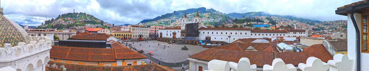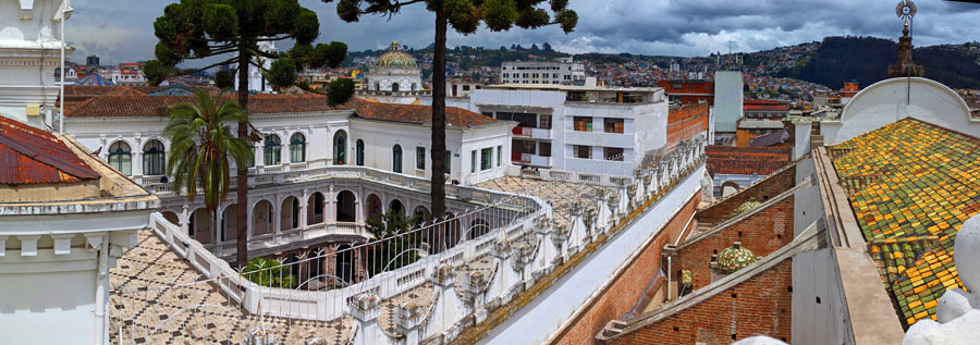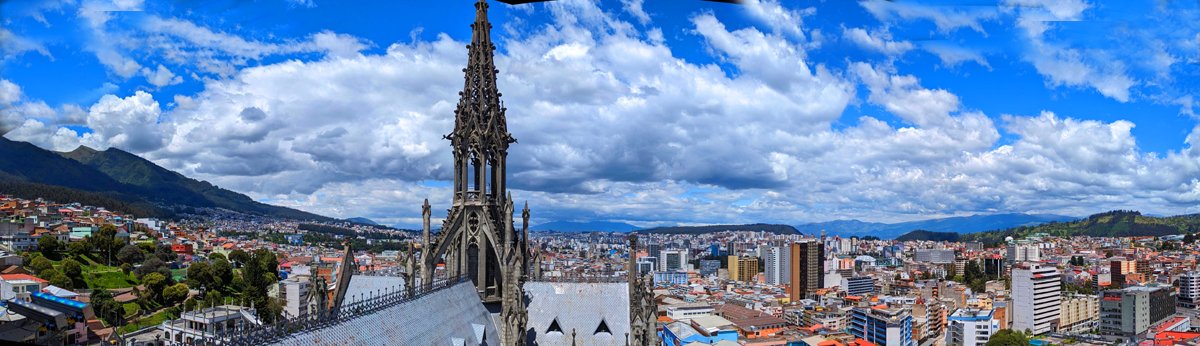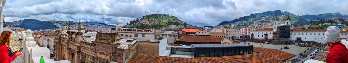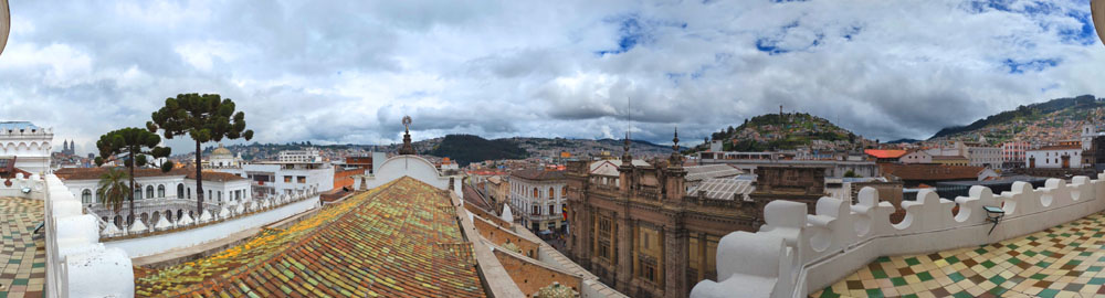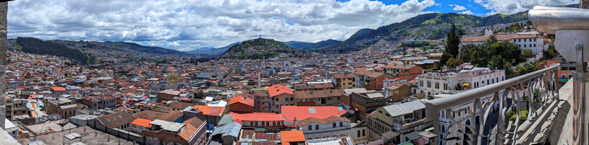 Again, this next panorama takes in the Virgen el Panecillo, but it looks more south/southeast along the roof of the nave of La Compania. That is the Museum of Money to the right.