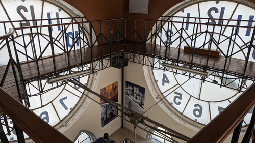 If you begin climbing the spiral staircase in the corner of the room (which Jason and I did), a ways up (but still in this room) there is a catwalk that runs all the way around the room. You can walk around it, which I did, but it is mainly for the use of the people who maintain the clock mechanisms.