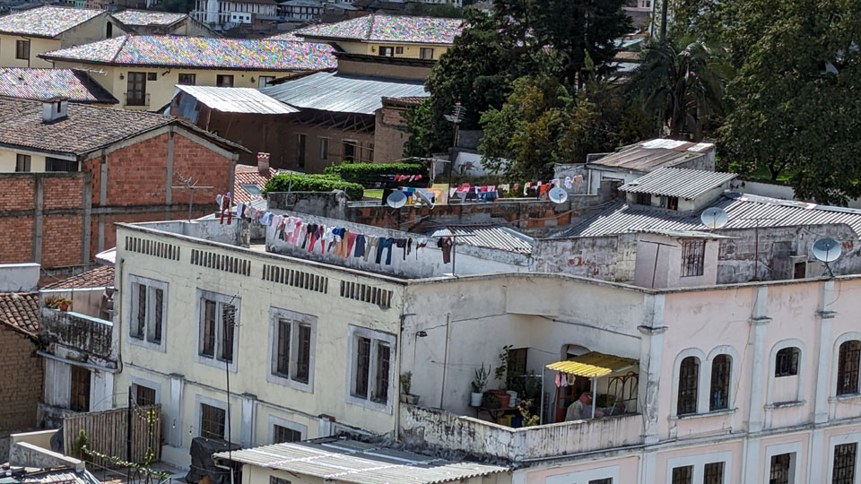 In one of my views looking around I spotted a kind of quirky sight, so I zoomed in on it. Maybe lots of people in the buildings in this old section of Quito now have washing machines, but it appears that not all of them have dryers.