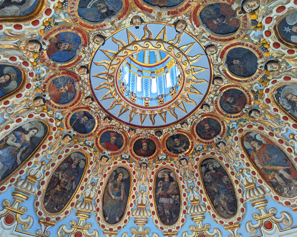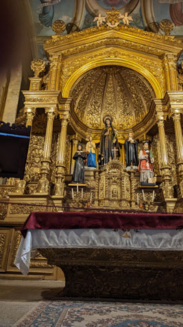 You can imagine all the effort that it took to pound raw gold into wafer-thin sheets, and then to meticulously cover all the nooks and crannies in the wood construction of the altar and elsewhere in the nave. It is always incredible to me how the faith of the masses can accumulate the wealth to finance, and put the effort into constructing, and take the time to decorate these houses of worship (more in Europe, Central America, and South America of course).