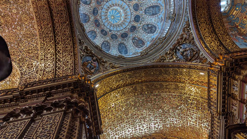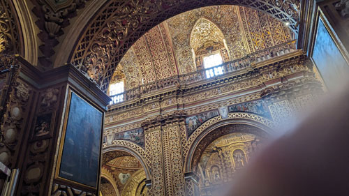 The greatest characteristic of the internal decoration of La Compania de Quito is its very Baroque forms in carved cedar wood, polychrome and bathed in 23-carat gold leaf on a red background. The main altarpiece, in the apse, and the richly decorated pulpit stand out above all. We were told by our guide that close to 170 pounds of gold were used to make all the gold leaf that covers just about every surface in the nave.