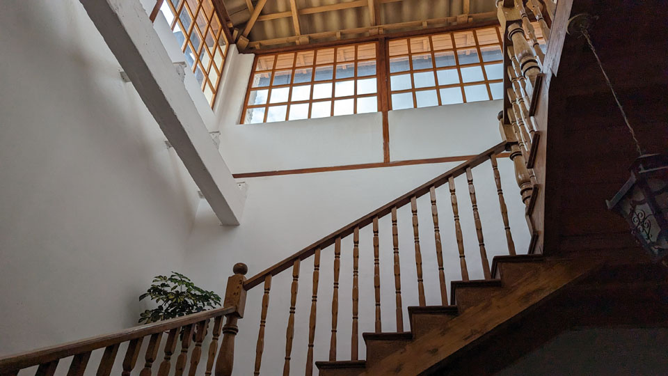 To the right of that picture is one I took from the opposite corner of the room on the catwalk, showing him about to ascend the staircase to the room above. It was a little tricky, climbing the staircase, as there is no way to pass somebody. So it was good that there weren't many people here today and we only had to wait for a few moments sometimes to go up or down.