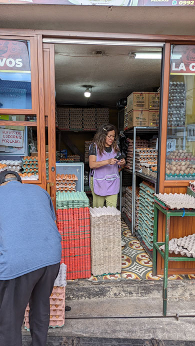 We intended to continue up to the corner of Calle Sebastian de Benalcazar where we could turn right again and come into the Plaza San Francisco. Just before we got to the corner, I passed a shop that only sold one item- eggs, of course. In the US, there'd be a sign like "Eggs R Us".
