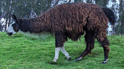 The llama is a domesticated South American camelid, widely used as a meat and pack animal by Andean cultures since the pre-Columbian era. Llamas are social animals and live with others as a herd. Their wool is soft and contains only a small amount of lanolin. Llamas can learn simple tasks after a few repetitions. When using a pack, they can carry about 25 to 30% of their body weight for 5-8 miles. The name "llama" (in the past also spelled "lama" or "glama") was adopted by European settlers from native Peruvians.