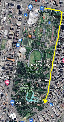 When we came aboveground from the Inaquito Station, we were on the south side of Avenida United Nations, the major east-west street that is the north border of Parque Carolina. We just headed east and then turned south along the park side of Av. de los Shyris.