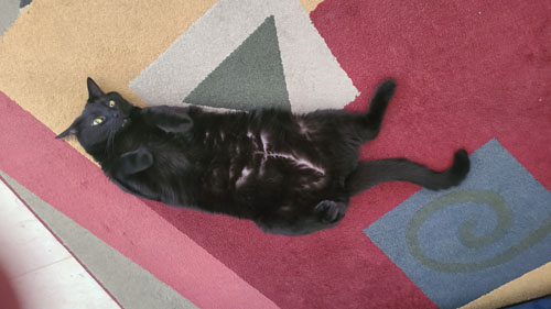 As for Cole, he has his own characteristic pose, which we affectionately call his "dead kitty" pose. He will lie in the middle of the rug, balanced on his back, with all four of his feet in the air. We've seen other cats in this pose on the Internet, but not many and not nearly as often.