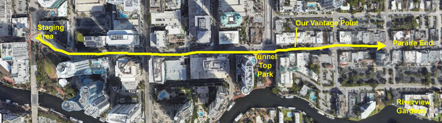 When we could hear the parade units firing up right around 11, we went to find a place we could stand. About midway down the block of Las Olas east of the Tunnel Top Park we found a place behind the barriers that was thinly-occupied, so we got some spaces on the rail and waited for the parade units to come by.