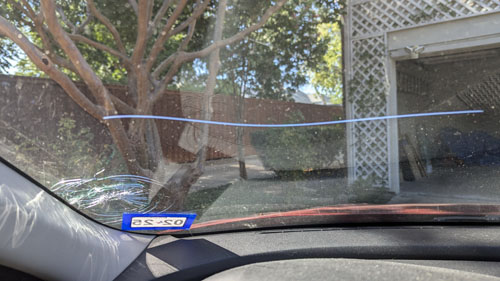 As I was driving my Elantra up I-35 just about 15 miles south of downtown Dallas, a pickup truck in front of me kicked up a sizeable rock, and it slammed into the lower-left corner of my windshield. It was so large that it almost came through the windshield, but as you can see in the picture below, left, did a great deal of damage. By the time I'd gotten back to the house, a crack had run almost entirely across the windshield, as you can see in the picture below, right.