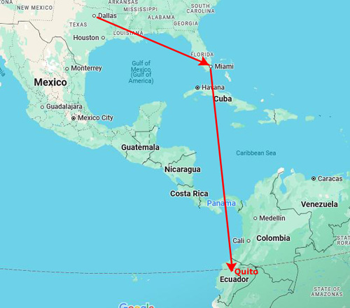 Not only did the routing on Avianca not go anywhere near Miami, the departure time from Dallas was much more civilized. American had changed their schedule such that to make the flight from Miami to Quito, one had to leave absurdly early in the morning for Miami. The Avianca schedule has the traveler departing at 12:45 in the afternoon. The Aviance routing goes almost directly south, making a single stop in San Salvador, the capital of El Salvador, after a three-hour flight from Dallas. The only drawback regarding the flight down is that the layover in San Salvador is a long one- 4+ hours. But if you have something to do or read (like my laptop or tablet or Fred's book) it's not that bad.