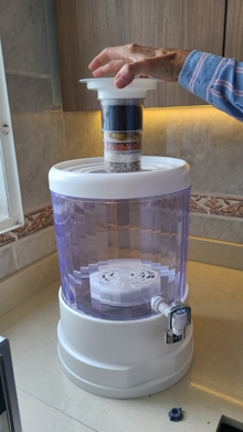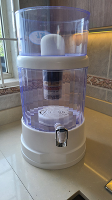 Below this upper reservoir is the larger reservoir that contains the filtered, treated water. Hanging down from the upper reservoir is a seven-stage filter, comprised of layers of filter material, each of which focuses on one or another impurity. I don't know exactly what they all are, but taken together they make the water drinkable and unlikely to cause any digestive problems except in the most sensitive of people. The water filters down through this system very slowly, entering the bottom reservoir at a steady but only moderate drip. Eventually, the water in the lower reservoir touches and then rises above the bottom of this filter, but fluid dynamics being what they are, the filter continues to work until the water in the upper reservoir is exhausted or the bottom reservoir is full.