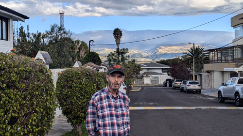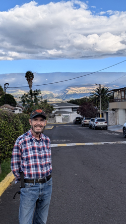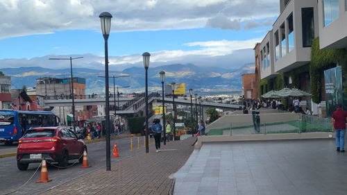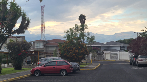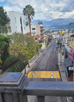 These views can be really spectacular on clear days, when the sunlight and clouds cast shadows on the hills in the distance. Incidentally, we can't really see Cotopaxi from here; the best views of it are from up in Quito, because here the hills and trees block it. Sometimes we can see it from the pedestrian overpass on the other side of the mall. Here are two more pictures looking down the street towards our gates: