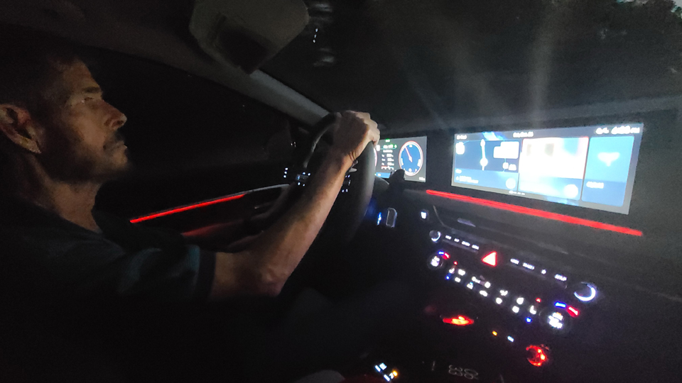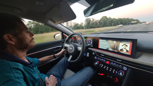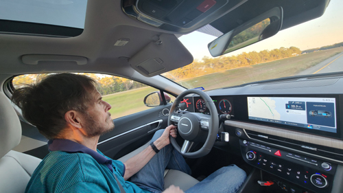 From where we get onto I-12, it is 90 minutes or so to Mississippi and then an hour or so across that state. In the Fall, this is usually where the sun begins to set, and in the afternoon light Fred chose to take a couple of pictures of the dashboard of his new car while I concentrated on driving: