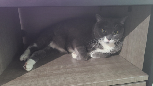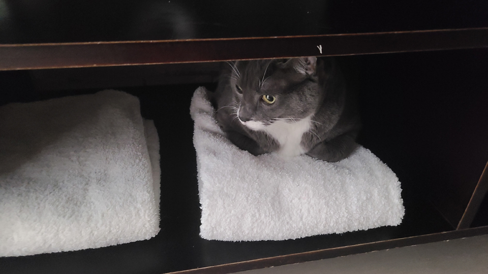 I must say that both cats seem to be good travelers. It's true that usually, maybe a few hours into the first day's driving, Bob tends to spit up, he only does it once, and only on the first day. We're prepared for it, and ready to do a "clean-up on aisle 6". Most of the time, both cats can be found sitting or sleeping in their carriers, although both of them will come out every so often, come up front to see what's going on, maybe stay for a little while, and then go right back to their cozy spaces. They hardly eat or drink at all in the car, usually waiting until we get to our motel. There, the cats get to eat and run around the room. Bob is an old hand at this, and after he spends just a bit of time stretching his legs, he tends to curl up in the cubbyhole shelf where the hotel puts the towels. This morning, Fred snapped a picture of Bob in the towel cubby.