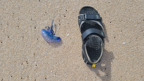 Walking along, we saw a large number of small, jellyfish-like animals that had washed up on shore. They weren't shaped like the jellyfish you might imagine, and were blue to boot. Odd animals.