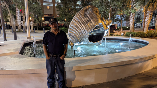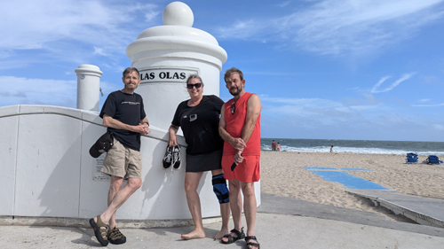 We crossed A1A and this brought us to the main entry plaza for Fort Lauderdale Beach. There are other entry points north and south of here, but this is the main one, and it usually decorated for various holidays. We had an obliging passerby take a couple of pictures of us at the entry plaze: