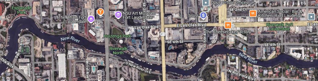 We often take a stroll along the Riverwalk, and so I wanted to include an aerial view of it here. The Riverwalk, one of Fort Lauderdale's major attractions, begins at Laura Ward Park. This small park lies between the historic Stranahan House and the multi-level garage of the Riverside Hotel. It is actually now part of the new Tunnel Top Plaza that was built on an extension of the cover over Federal Highway as it drops down into the Kinney Tunnel. The Riverwalk begins at the small park (where there is also a very busy Water Taxi stop) and heads west, passing south of Stranahan House and the Icon Las Olas on a walkway that is cantilevered out over ten feet or so of the New River.