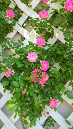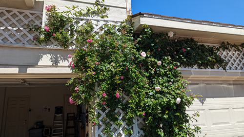 Anyway, they are blooming now, I want to include some pictures of them here. At the left and right are a couple of vertical pictures of the roses on the left, shadier side of the garage. Below is a photo of the right side of the garage trellis, showing the same rose variety (mixing in with a different rose that my next-door neighbor, who put up a trellis also, has). The top trellis has not yet gotten significantly covered from either side, and I doubt the left side will every crawl up that far.