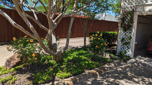 Sadly, my roses (the same variety as David's) haven't covered the trellis as well as his. The reason seems to be that because of the crepe myrtle behind my garage, and the fact that just west of me, over our fence, there are tall, leafy trees, my roses don't get nearly the amount of sun his do.