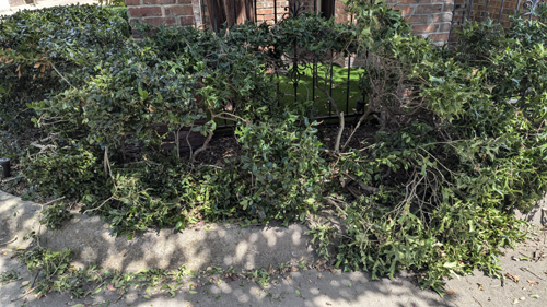 Here are a couple of photos of interest only to me. Another resident was having a delivery from Lowes. They weren't sure where in the community she lived, and their truck (according to my neighbor, Floyd) came up in front of my townhouse, and when they realized the address they were looking for wasn't accessible from the front of our community, tried to turn in front of my unit to go around my unit and back out to Inwood Road. But their truck was too big to make the turn, and when I heard Floyd yelling at someone, I came out to see what was going on. What I found was that the truck was just turning behind my garage to go back out to Inwood, and what they had done is run over all the holly shrubs at the front corner of my townhouse: