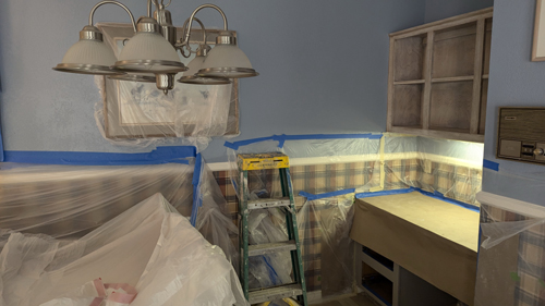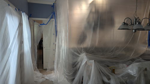 The next day, the first thing the workers did was to cover everything they could. While all the doors would be refinished in the garage, the cabinet frames would have to be refinished while still on the wall, and this was indeed going to generate a lot of mess- if only from the sanding steps.