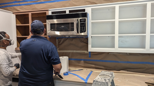 Work on the cabinet frames was harder, because they remained attached to the wall, and the guys had to work around things like the microwave. At left you can see Juan and one of the workers in the kitchen starting on the frames to the left of the microwave. The cabinets to the right aren't finished, but one or two of the stain-applying steps has been completed, and at the moment they just look as if they've been painted.