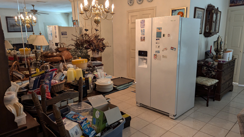 This process took me a day, and before I started, the workers helped me remove the fridge handles and manhandle it into the dining room; at least I had a functioning fridge for the duration. During the time I moved everything out, I found a number of things I'd been looking for, and I also identified quite a few things I really didn't need anymore and was able to discard.