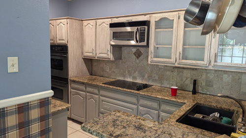 I may not have mentioned that it was only the upper cabinets that had the complex refinishing process applied to them; we decided that the lower cabinets should just be painted a complementary color, which turned out to be a light gray/blue. We got this idea from some other videos that we watched online; and we even found the color we used in one of them.